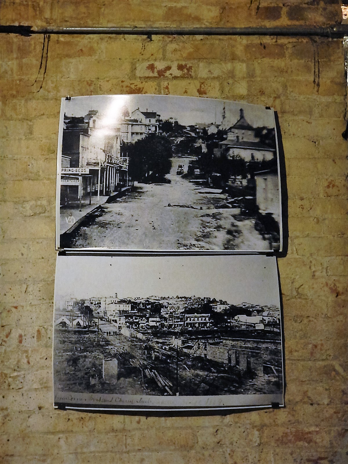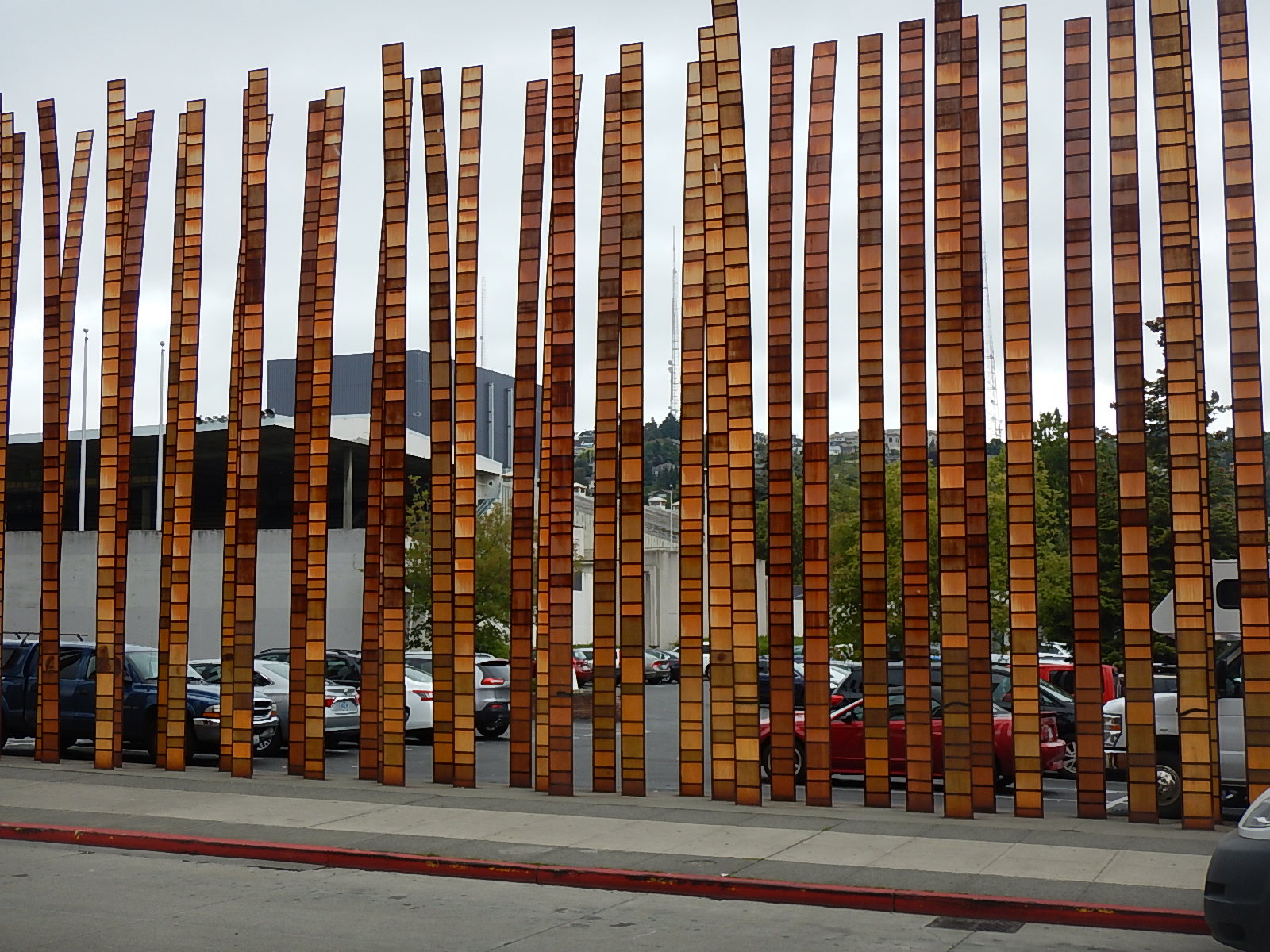 On our last full day in Seattle we decided to take an underground tour that Karen and Charley had told us about – thanks for the tip guys. This was fascinating explanation of the development of the city, especially after the great fire in the 19th century. Most of the lower city was made of wood and 30 square blocks went up in flames after a fat fire in one house. The city elders decided to rebuild the city with brick and stone and to raise the street level to reduce the steepness of the streets and help with drainage issues. They rebuilt the houses and businesses on their original sites, but told the owners that eventually the entrances would be on what had been the first floor level. When each building was finished they put shuttering along the edge on each side of the road, a pavements width away from the building, and infilled between them up to the first floor using mud and rock water-blasted from the cliffs. They then capped off with road surface and built brick vaulted arches linking the new road with the first floor entrances to the buildings. This left a network of old pavements on the lower level which you could still access to walk around the block underground. The fire dept. said they had to have fire walls to stop fire spreading from block to block, but it is all still there as it was. It was a fascinating experience. After the tour we took a stroll around the old town known as ‘Pioneer Square’ and saw some fantastic glass work, one piece we might use for inspiration when we get home.