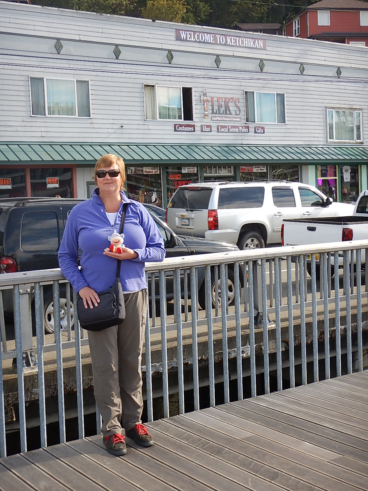 Early on Friday morning we moored in Ketchikan, a small harbour town (about a mile wide and three blocks deep) which grew up around a river which salmon use to spawn. The weather was clear and bright. We haven’t booked any excursions on this cruise, we have chosen to explore the three towns we are visiting rather than travelling elsewhere by bus or boat. After breakfast we went ashore and picked up a map outlining a self-guided walking tour of the town (guided tour $49 per person!), it took us along the waterfront then up into town passing some historic buildings (1890’s). Creek street is a wooden staircase running alongside the salmon creek, it is crowded with old clapboard buildings most of which are now café’s and souvenir shops but which were originally brothels serving the fishing crews and Klondike gold miners. That seems to be the core of Alaskan heritage fishing, gold mining and brothels!! We followed Creek Street up the river to a run of rapids where we stood mesmerised watching salmon trying to leap upstream, the current was so strong it was hard to believe that any would make it but some did and dozens waited in the shallows for their turn. Further upstream we saw the spawning ground and evidence of salmon that had achieved their objective and then died. We visited a Totem Heritage Centre, a working museum where they are preserving totem poles and running workshops to ensure the skills and traditions of the Tlinkit tribe continue. We saw some fantastic artefacts, totem poles, masks and beadwork, beautiful. On the way back to town we stopped and talked to a local woman who was happy to chat about her town and its Tlinkit heritage. Finally, we headed back to the ship in time to sail for Juneau and to enjoy the fjord like scenery and snow-capped mountains.
