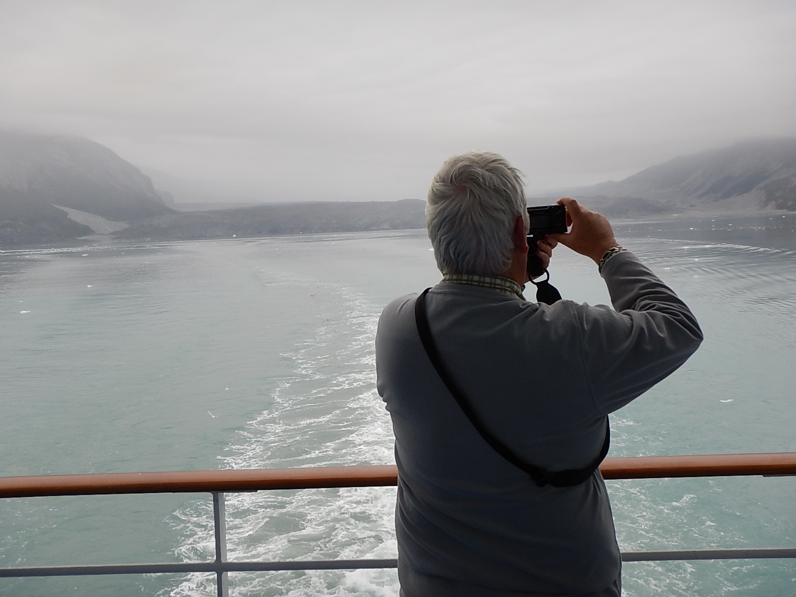 Monday was spent cruising Glacier Bay; this is what most people book this cruise for. Glacier Bay is a National Park and is rigorously managed by the park service to maintain it wilderness status, only two ships a day are allowed into the bay and it is 65 miles to the nearest road. It is breathtakingly beautiful. The bay is a long thin inlet with mountains and glaciers on both shores, some of the glaciers are ‘hanging glaciers’ which mean they are high up in the mountains, others are tide water glaciers which come down to the water an ‘calve’ chunks of ice into the water. Two park rangers came aboard the boat and provided a commentary as we sailed very slowly up the bay, and at the top, at the Margerie Glacier the engines were turned off and we drifted silently in front of the glacier, the only sound was the occaisional rumble which sounded like thunder but was the sound of the glacier moving down the mountain. Margerie Glacier moves approx. 10ft every day. Everybody spent ages on deck, the air was cold and clear it was a really memorable experience. Eventually we turned around and headed back down the bay passing more glaciers, one of which is a rarity, an advancing glacier which means while nearly all other glaciers in the world are shrinking it is growing – maybe there is hope after all? While we were on the balcony on deck 8 watching out for whales Terry and Jenny arrived with a bottle of chilled white wine and we spent a happy hour with them sharing the wine and enjoying the scenery.