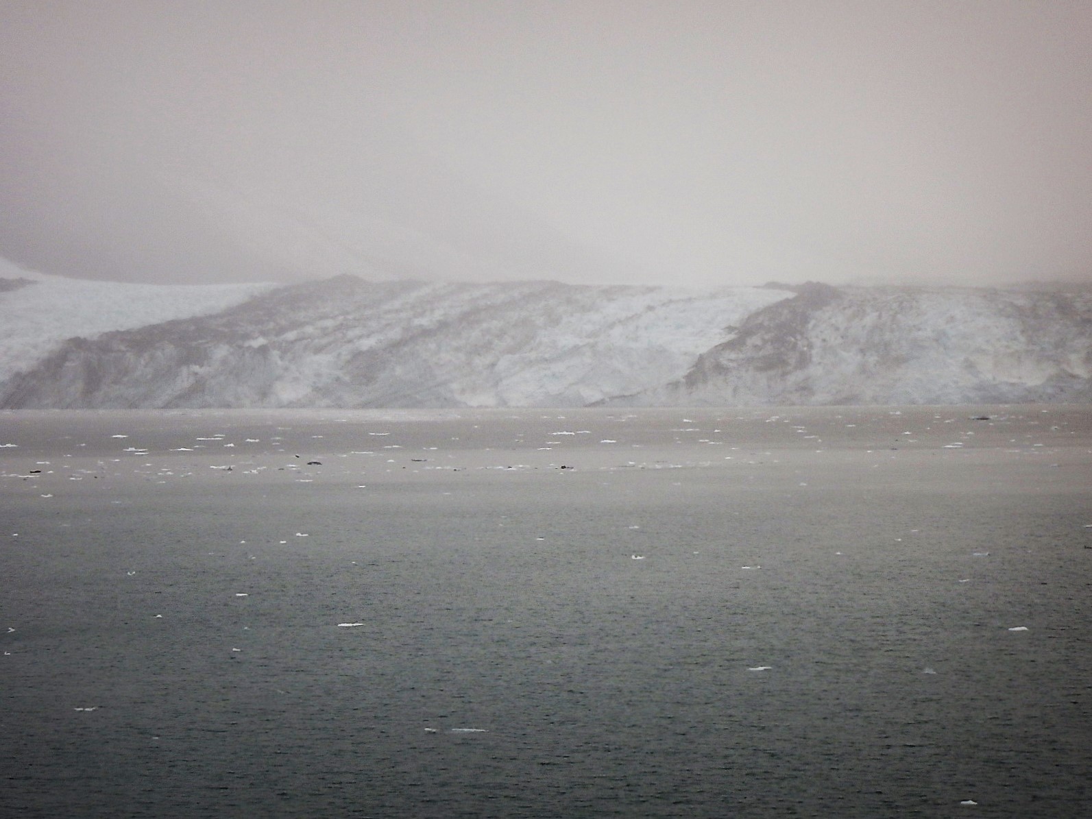 On Tuesday the weather finally broke and we woke to heavy cloud, mist and rain. It was another day at sea so we kept our wrist bands on and headed up to the buffet on deck 14 to see what we could see as we ate breakfast – answer not much! We had arranged to meet the Australian trio for coffee, Judy had to leave for a tour group meeting, but we ended up spending three hours with Terry and Jenny, Terry is Sri Lankan and we were keen to get his thoughts on our visit there in February. Late in the afternoon we arrived in College Fjord, another beautiful inlet with a series of glaciers all named after American Colleges; College Fjord is also a whale hotspot and Mark spotted a large pod of Orca’s swimming alongside the ship, we only saw their fins breaking the surface but it was still a thrill. The Harvard Glacier is a tidewater glacier, it is 2km wide and 100m high, a real sight to behold and once again the captain turned off the engines so we could drift in silence in front of it. We also saw Johns Hopkins Glacier, another advancing glacier as we cruised back down College Fjord.