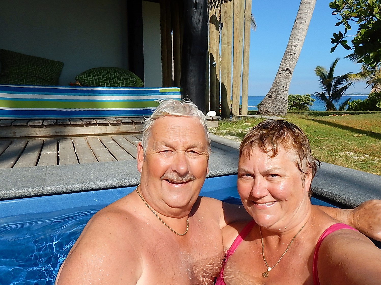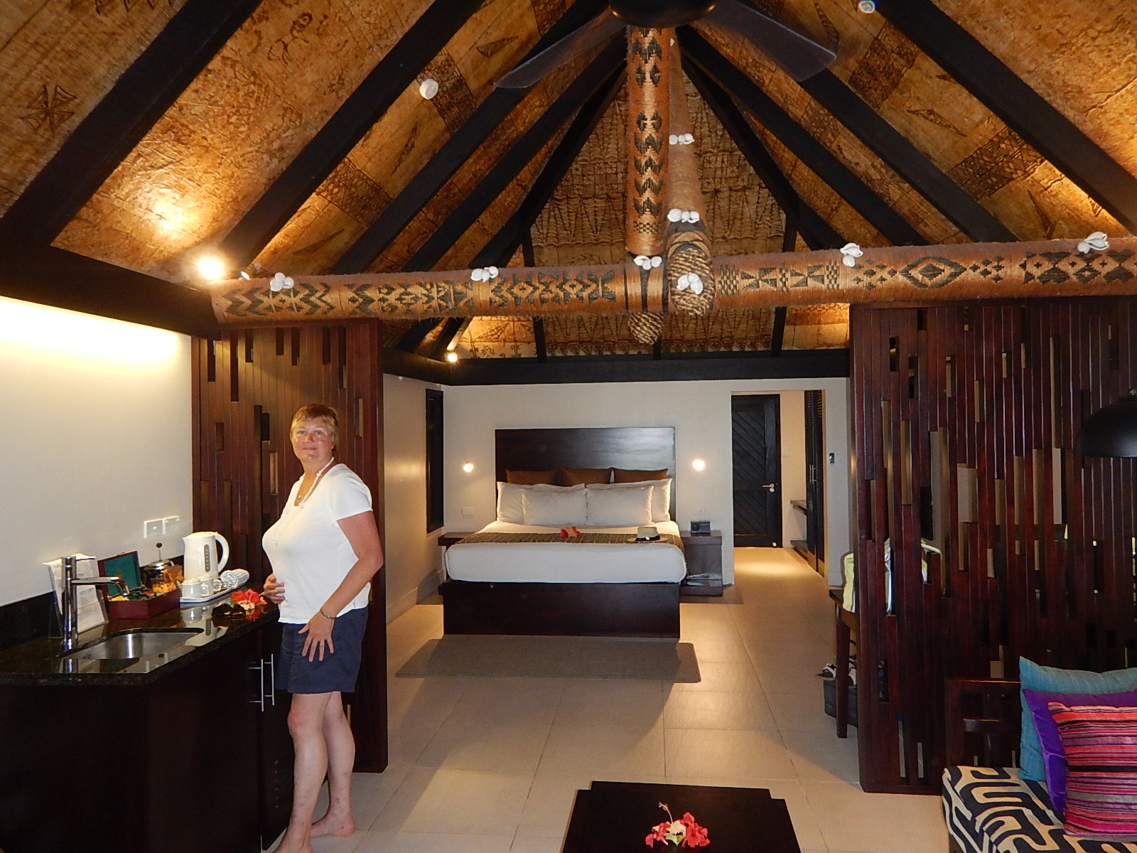 Our room was a beachfront bure, the Fijian equivalent of a Fale. It was a big room with a lovely bathroom and a sitting room area with a sink and a fridge so we could make tea and coffee and keep drinks cold. The end of the bure faced the sea, outside we had a private terrace with a plunge pool, a table and chairs, a day bed under a thatched awning and an outdoor shower . We also had a lawn with two sun loungers and steps down to the beach – what more could we ask for! Snorkelling equipment was available for loan so we kitted ourselves out and headed for the reef which was about 20ft off shore, it was even better than the reef we explored in Savai’I, lots of bright coloured fish of all shapes and sizes – see the pictures.