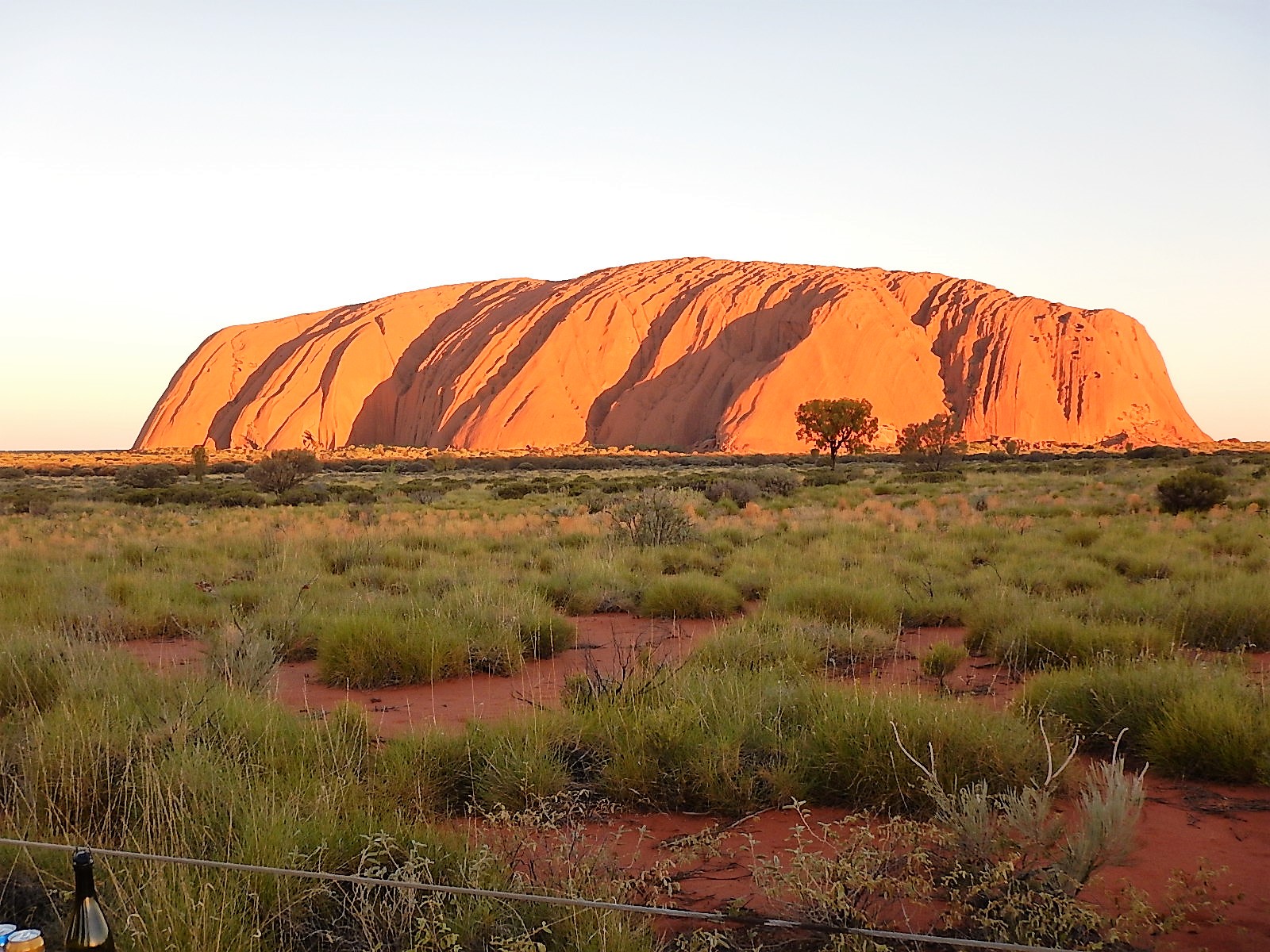The next day we were due to take two tours, one to see sunrise over Kata Tjuta and the other to watch sunset at Uluru. Both included guided walks to view the rocks close up. The mini bus for Kata Tjuta picked us up at 04.45, yes, 04.45, we had to set our alarm for 04.15!! We set off in the dark and stopped at a viewing platform looking across the desert floor to Kata Tjuta, the moon was quite bright so it was lovely walking the path through the scrub by moonlight. As the sun came up we watched the rocks change colour in front of us with shadows changing the shape of the rocks as we watched. Once the sun had risen flocks of birds appeared as if from nowhere and perched in the bushes and trees to warm themselves in the first rays of the sun. From there we drove to a picnic area where our guide laid out cereal and fruit, toasted raisin bread, and made fresh coffee to wash it down. By the time we finished it was nearly seven o’clock. We drove to the foot of Kata Tjuta and followed a path into a gorge between two of the massive rocks, it was only a narrow gorge and the rock walls on either side were 350m tall. It took us about an hour to walk in and out again pausing along the way to learn about some of the native trees and shrubs. By 9.30 we were back at the hotel and glad to escape the heat which was heading up towards 36C.