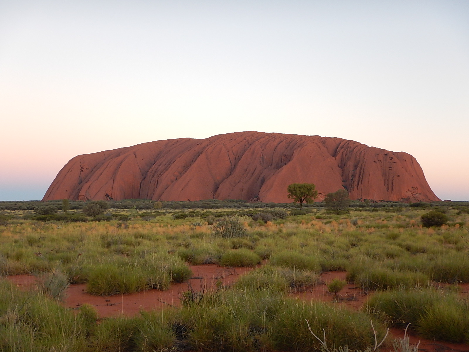 We kept cool during the afternoon and had some lunch in the hotel restaurant. At 15.45 we boarded another mini bus and headed out to Uluru, first stop was a photo opportunity to take the picture of the rock that everyone recognises, the one that makes the rock look very regular and oblong, guess what, Uluru is triangular and that view is its shortest side! Many places around the rock are considered sacred by the local indigenous peoples and photography is forbidden, that is why we only every see one perspective of the rock. From there our guide took us right around the rock stopping at two places to do short walks into rock ravines to view waterholes nestling at the foot of the rock. She showed us caves and rock paintings and a ‘kitchen cave’ used by women for thousands of years where we could see rocks warn smooth by generations of women grinding seeds for flour. The rock itself was amazing, it is one huge slab with a surface that looks like scales, the red colour is rusting iron deposits in the stone, underneath it is pale grey. We saw two waterholes which were immensely important to the local communities and are still considered sacred. One thing we particularly noticed around Uluru and in the desert around us was that, apart from bird song near the waterholes, it is virtually silent, it is a very moving place to visit – what a privilege.