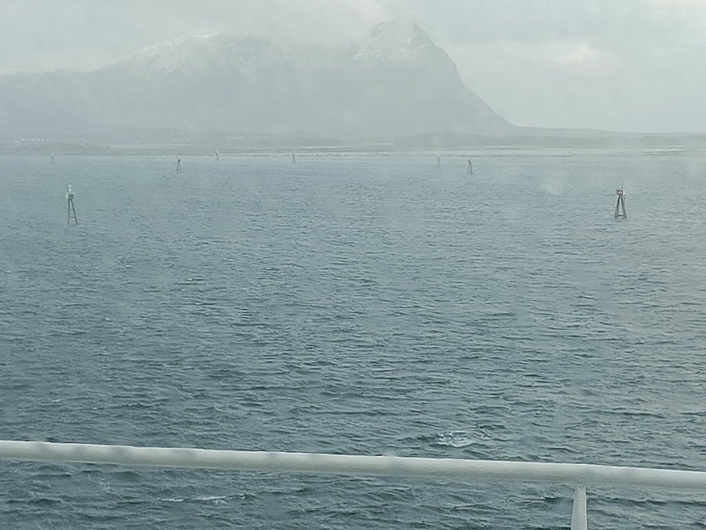 Today is Thursday, we are heading south again down the west coast benefitting from the shelter of the Lofoten Archipelago. The islands here are gentler and more rounded than the massive rock cliffs we have been seeing. They are scattered with small farming communities and look lovely, especially when the sun catches them. Unlike our trip north a few days ago all the islands are now dusted with snow and we occasionally see snow squalls blowing towards the ship and briefly engulfing it. It is very dramatic.