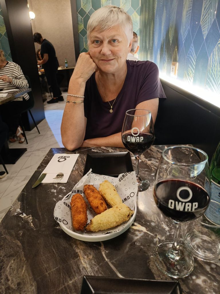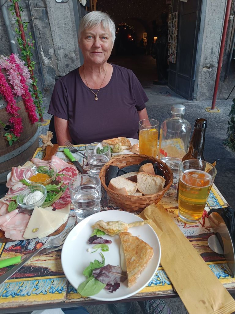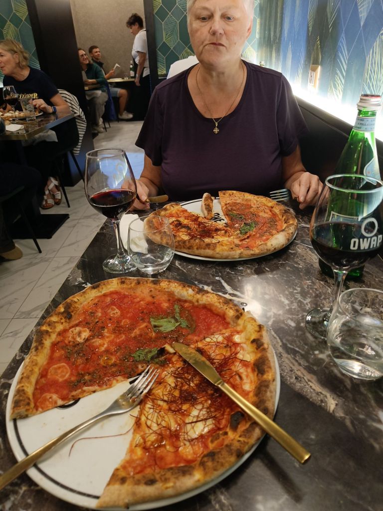 After a drink in a cafe we headed back to the hotel for a break before dinner. We were determined to have pizza whilst in Naples and discovered OWAP (One World,All Pizza) had one of its two branches very nearby. It was highly commended on TripAdvisor so we booked a table. The pizza was amazing, I don’t understand how they made the flavours so rich and the crust so thin they were delicious. We also tried two local delicacies as starters, zucchini flowers stuffed with ricotta cheese and deep fried (lovely) and potato croquettes flavoured with salami (ok but not as good as the Spanish version). A glass of local red wine washed it all down and we were ready to head ‘home’.
