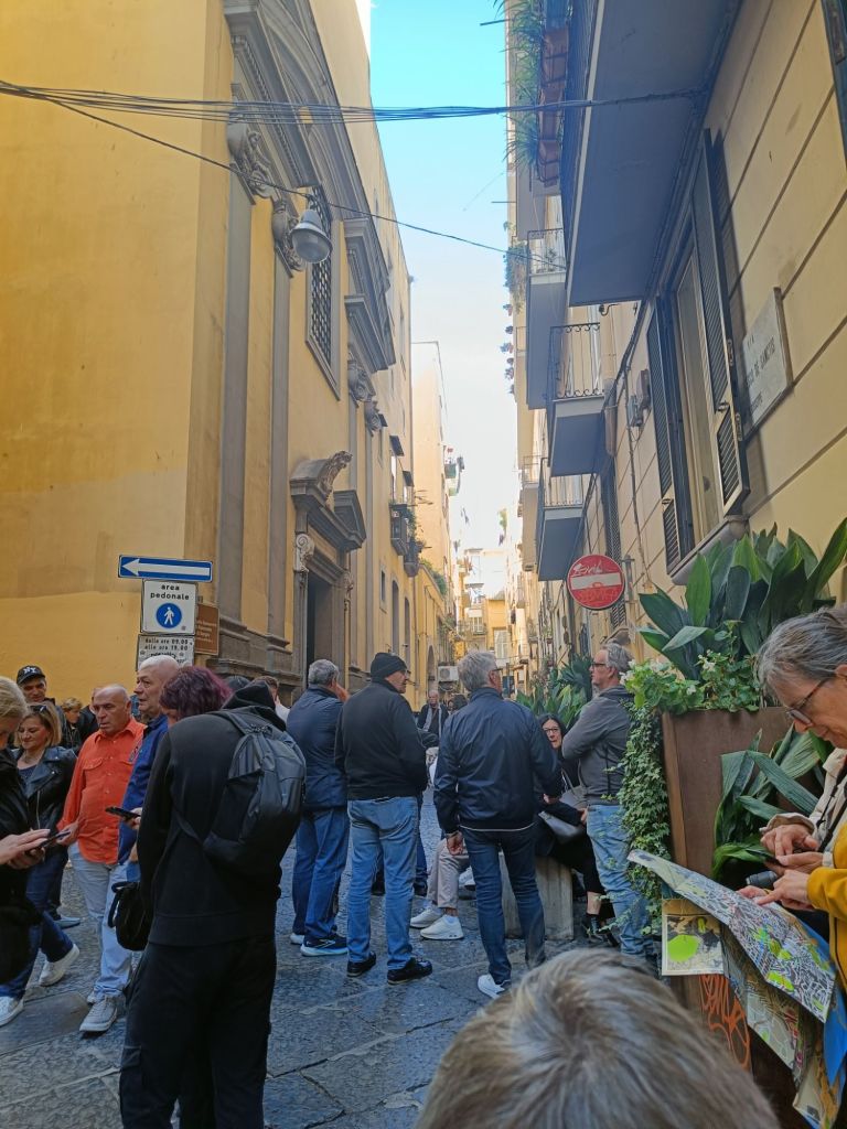 On arrival in Naples we caught the metro to the designated station and found ourselves walking along busy cobbled backstreets with no pavements. Eventually we found our hotel down a narrow alley, it took us a while, partly because the picture on the hotel website is ‘from’ the hotel, not ‘of’ the hotel – very confusing.
