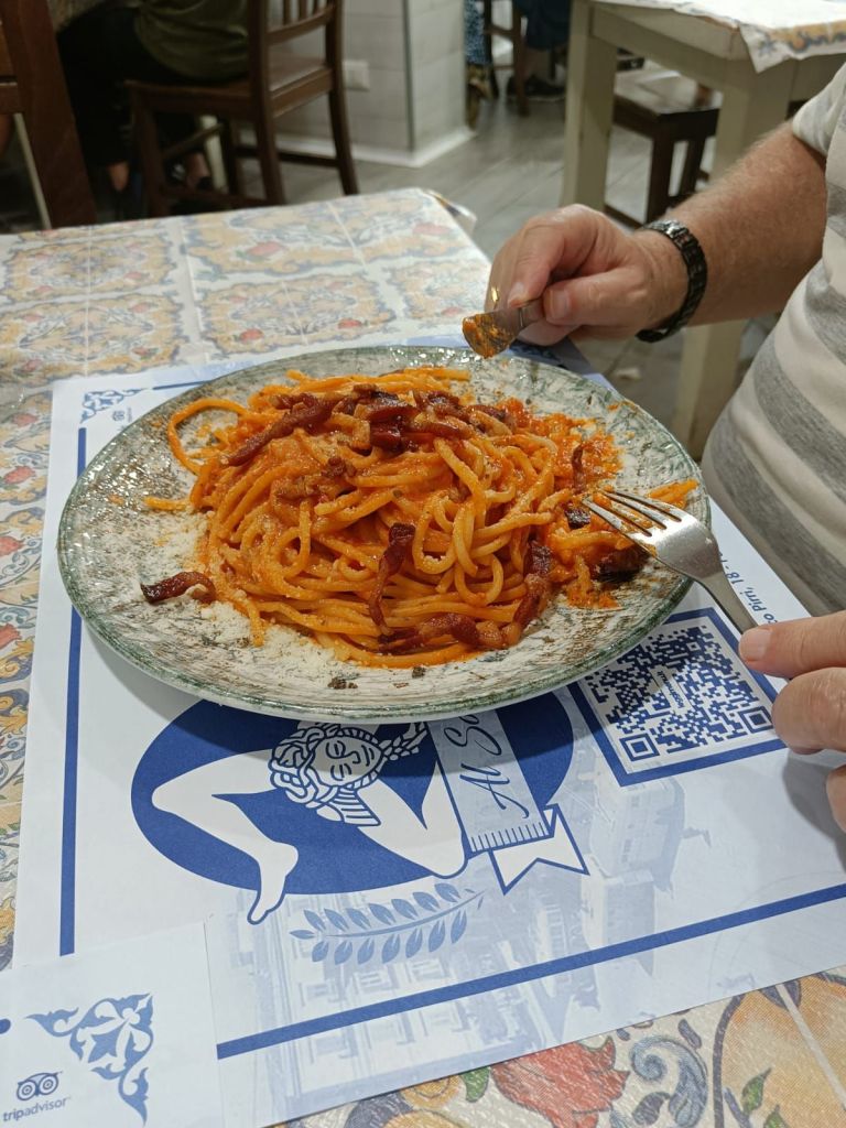 Our hesitation paid off, come dinner time we were ready to visit a nearby trattoria. We watched tables of locals ordering platters of antipasti, bowls of pasta and plates of meat and seafood. Knowing our limits, and to the disappointment of our waiter we ordered a carafe of local red wine and two plates of pasta (they were huge and very filling). We must look like amateurs!
