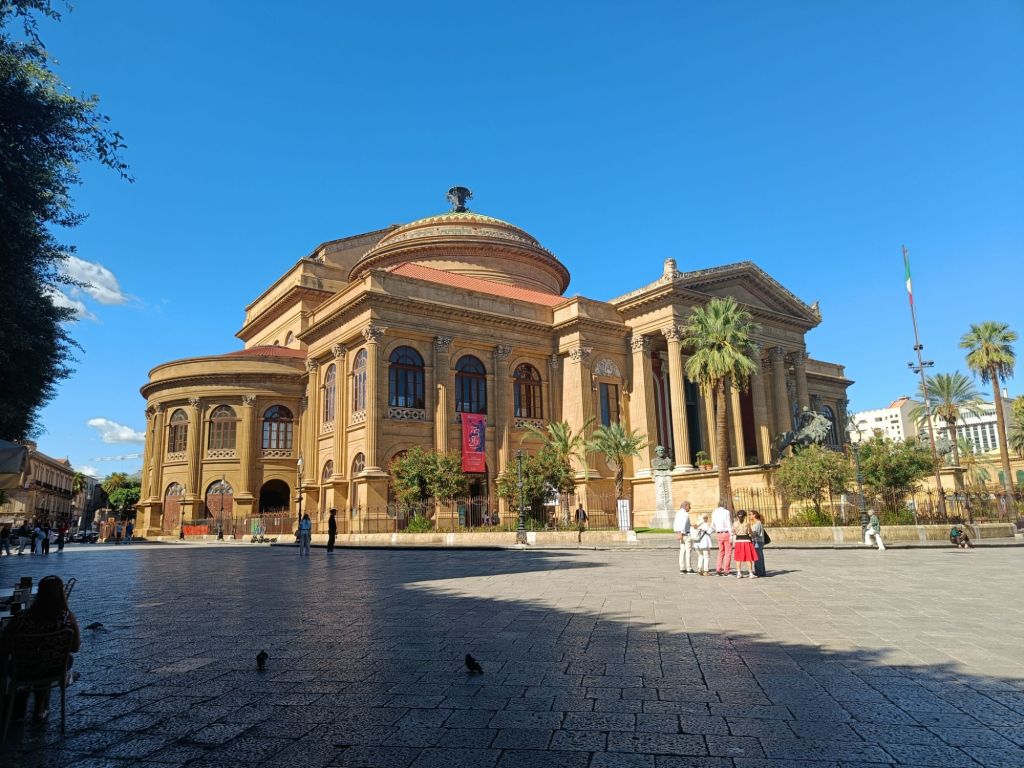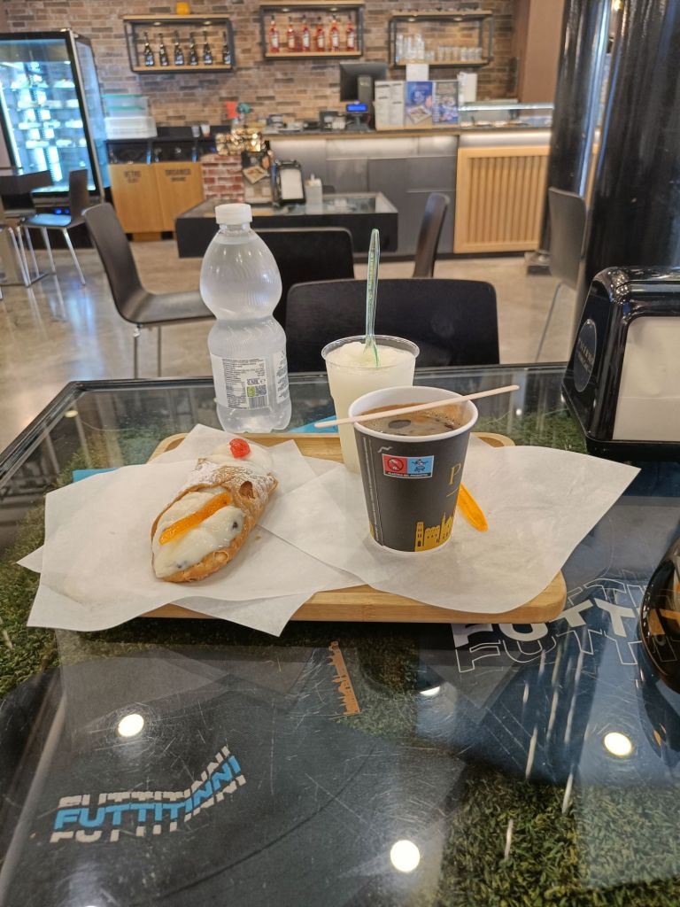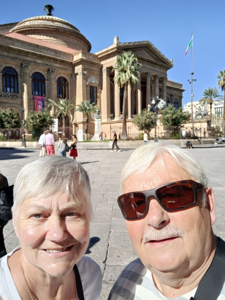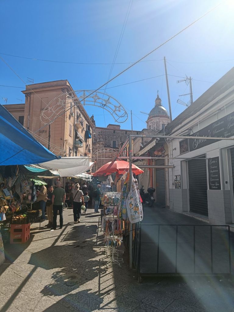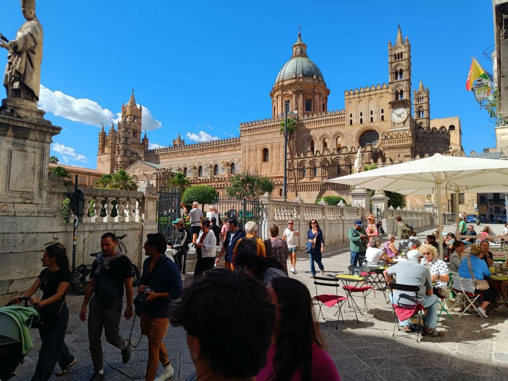 Turns out there is no terminal building in Palermo and we had to leave the port on foot among all the traffic coming and going from ferries. There was no sign of the bus stop we needed so we decided to walk towards the centre of town and see what we could find. The first thing we found was a lovely cafe/ pasticceria so we took a table outside and asked the waitress for two cappuccinos and whatever the typical local breakfast option might be. It turned out to be a large baked sweet pastry generously filled with sweet ricotta cheese, lemon zest and candied peel (don’t tell the Helston diabetes team!). Suddenly the morning was looking up.