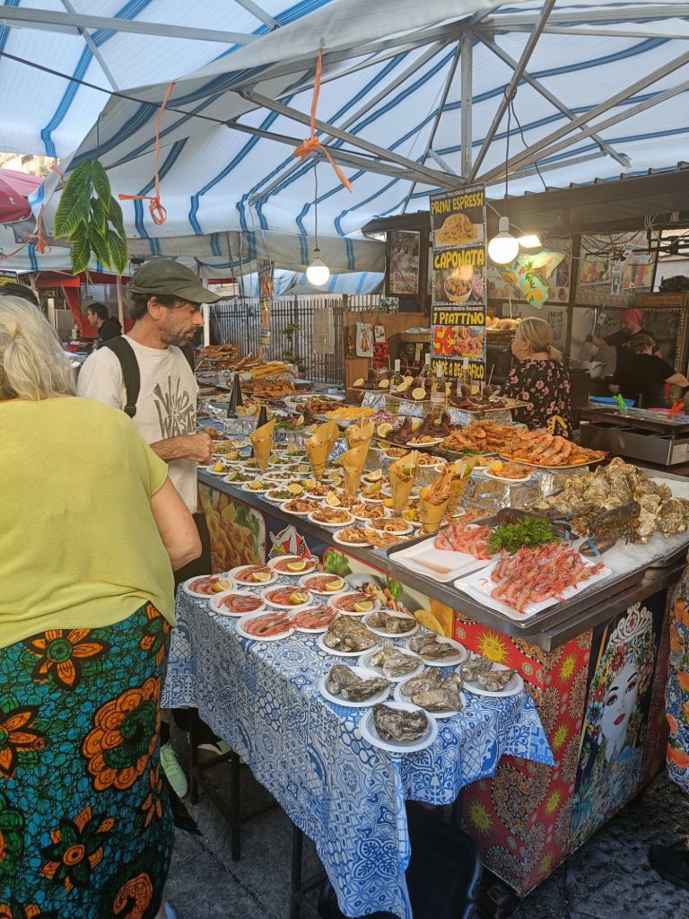 The staff at the hotel had recommended we visit the local Ballaro market so we made our way there around lunchtime. We weren’t prepared for the huge, vibrant market with amazing stalls stacked with fabulous fruit, vegetables herbs and spices, meat, fish and cheese. There were also lots of restaurant stalls with plates of food on display, the idea seemed to be that you choose what you want and they bring it to the table, some dishes were raw and were taken away to be cooked on demand. It was amazing to see but all the food was uncovered, there were lots of people wandering about, cars and scooters squeezing by and quite a few flies. We enjoyed the spectacle but decided not to partake.