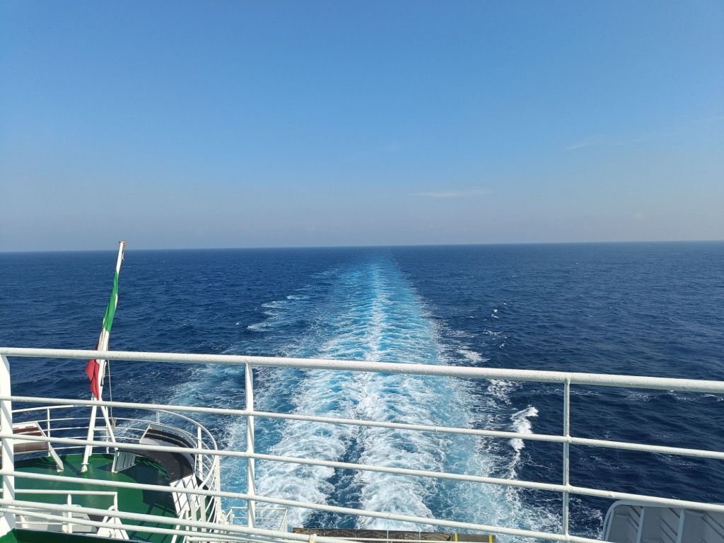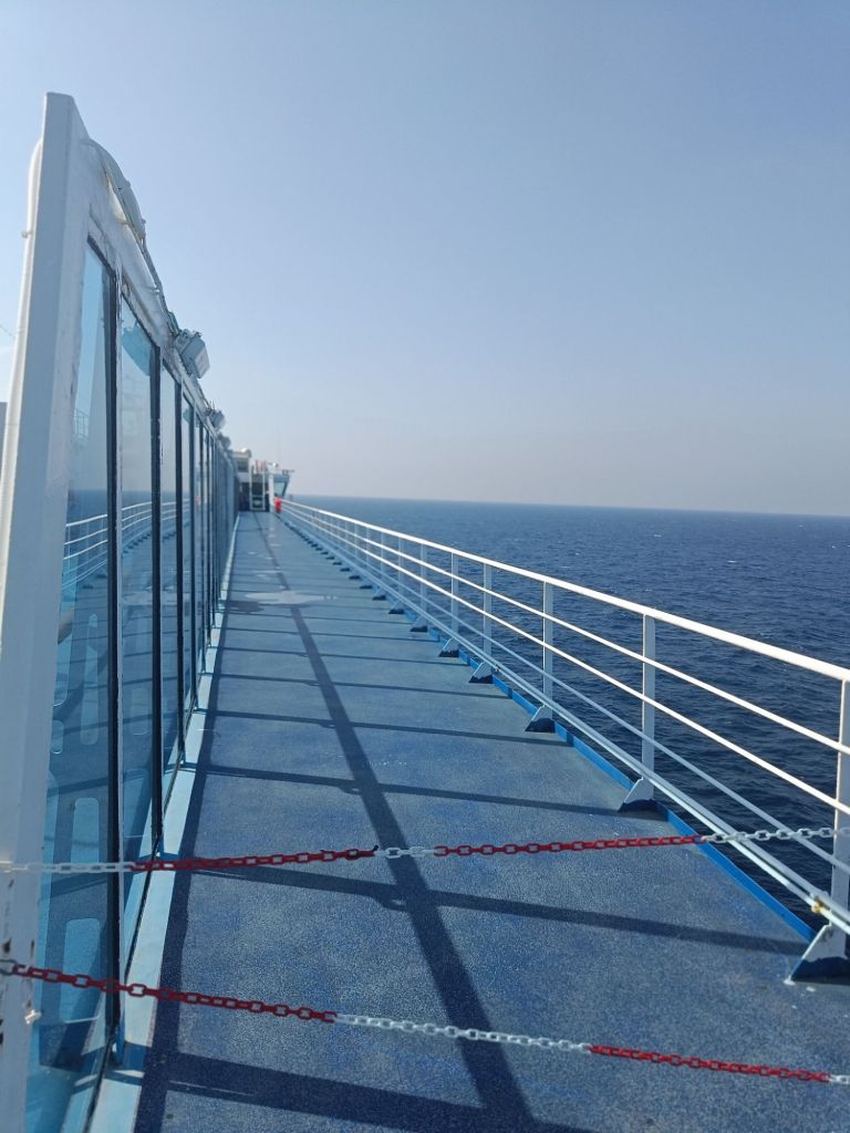 Our experience accessing the ferry at Civitivecchia was similar to Naples and Palermo. There was no public transport connection between the railway station and the ferry terminal, we shared a taxi with another passenger who persuaded the reluctant driver to take us the three or four kilometres to the terminal. We checked in, collected our boarding passes and discovered that it was another three kilometres to the ferry, but hurrah there was a shuttle. Sure enough five minutes later a bus picked us up and took us half way to the boat. The driver pointed to another bus in the distance and told us to walk to that. There was a maze of coned lanes to follow so we picked the one that looked too narrow for cars or lorries and set off. The second bus took us along the pier beyond the ferry and dropped us by a tent which contained the luggage scanner. Once through the scanner we had to walk the length of the ferry, cross the vehicles approaching the ramp and walk onboard.