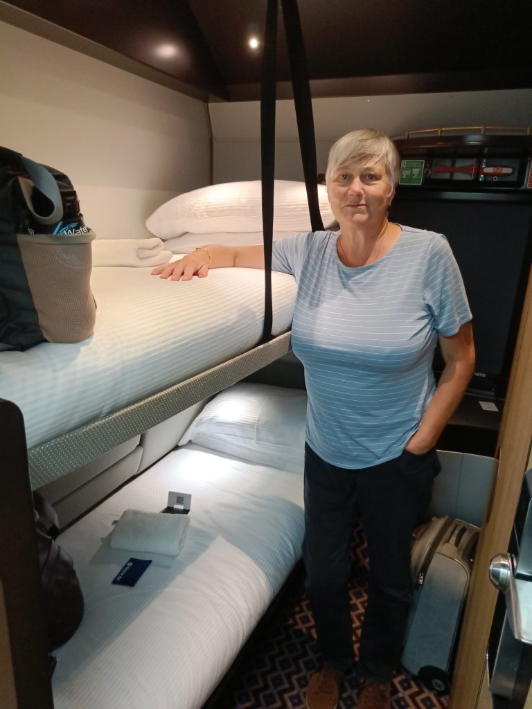 We are on our way! We boarded the Riviera Night Sleeper at 9.30 and found our cabin. It is snug but well equipped and has lots more head room in the bunks than the American version we have experienced, on those trains you couldn’t turn over in the top bunk without getting your shoulders wedged against the ceiling.