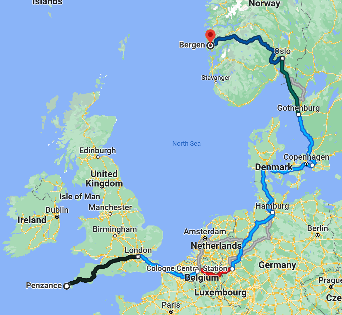 We start at Penzance station and catch the night sleeper to London. We will then make our way over to St. Pancras International. Here we will meet Terry and Jenny and board our train to Amsterdam. Here we have a two night stay and then move on to Hamburg for a one night stay.