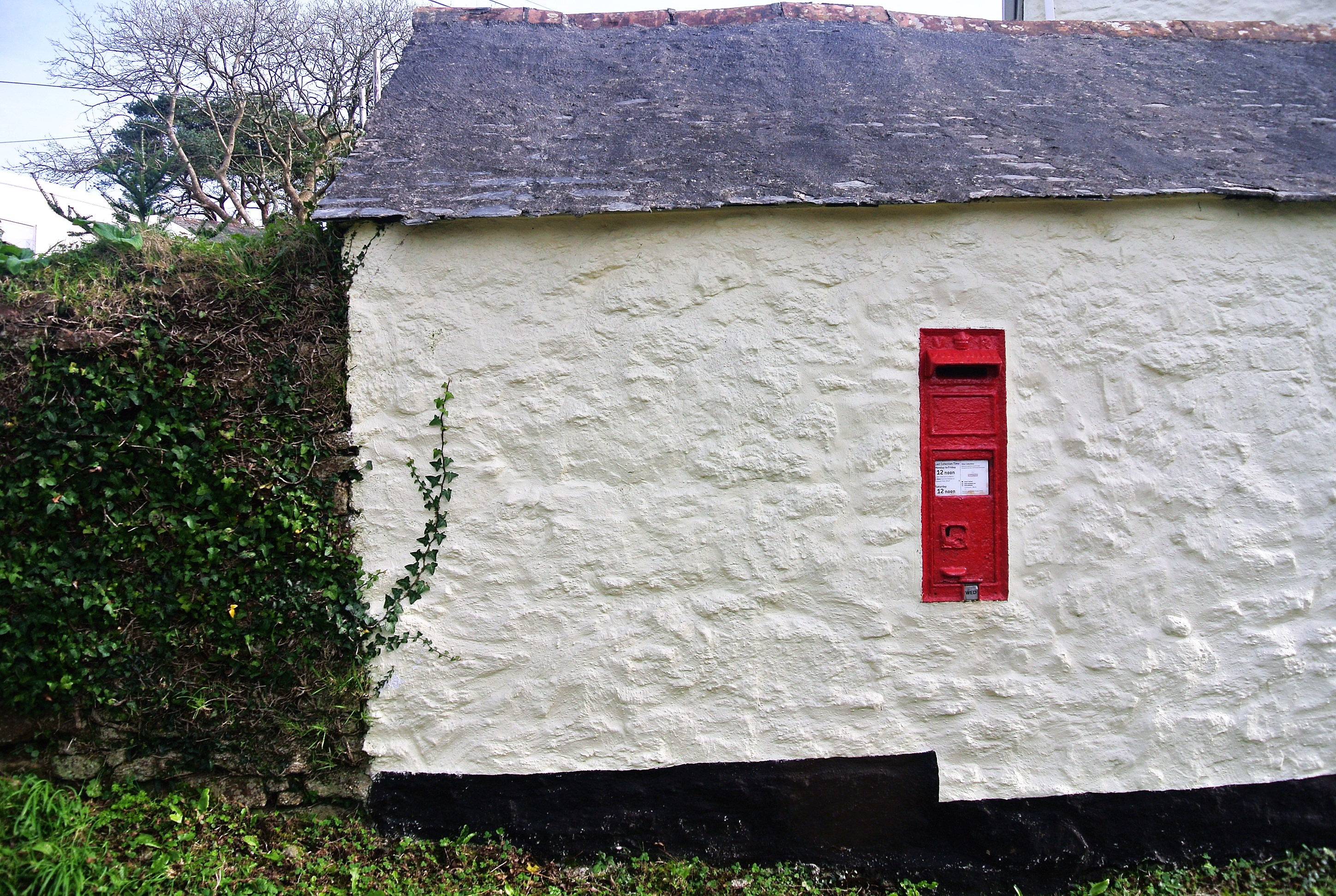 Todays theme was to take a picture featuring a coloured image against a neutral background. I chose this one as it puts the post box in context. This box is a Victorian one and if you look carefully you can just make out the V R on the lip of the box. Locals know to post their letters in the morning before the midday collection, slugs are active overnight and any lingering post gets slimed! The box was out of use for a month in the summer when a swarm of local bees took up residence. Oh to live in the country!